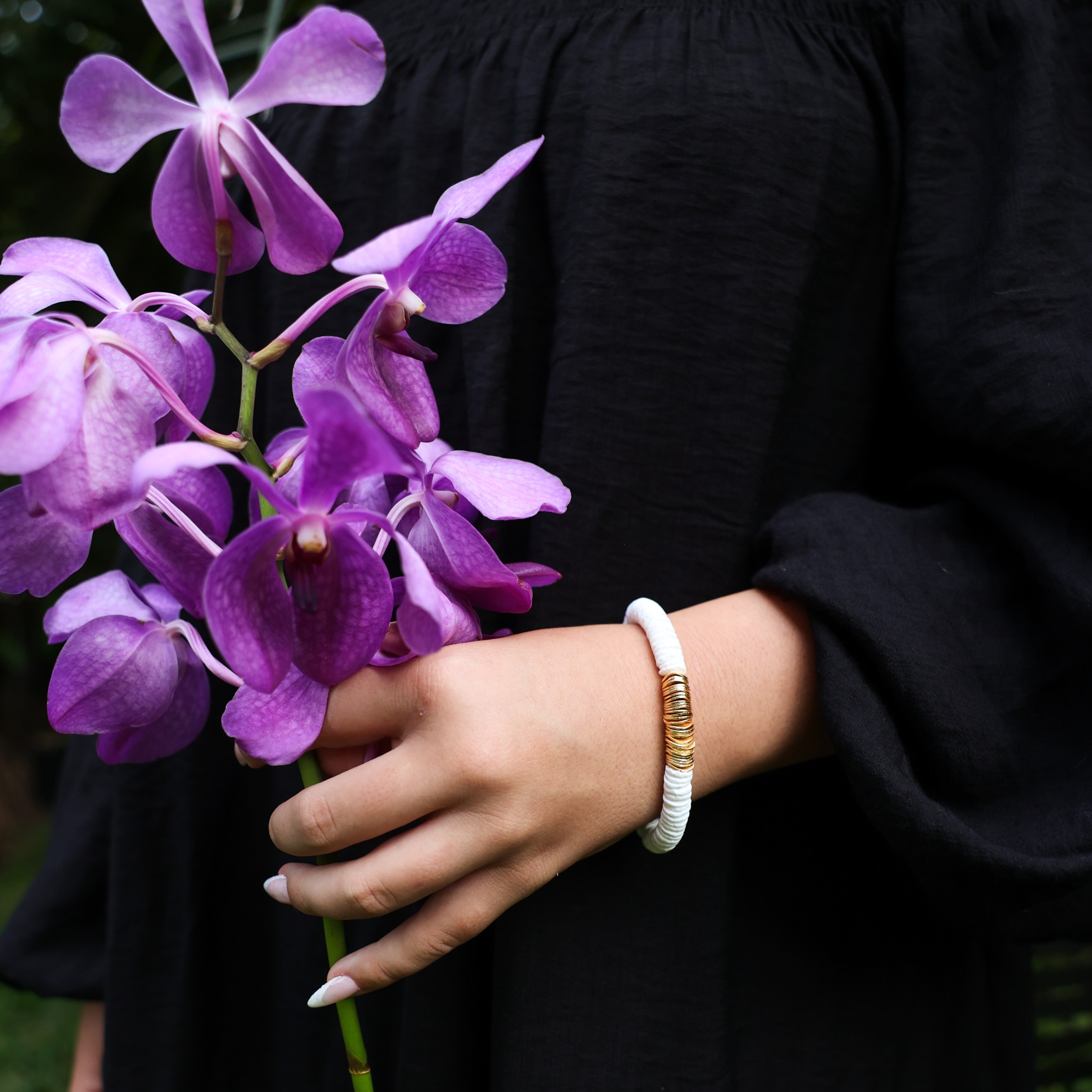 The puka bracelet, elevated. Natural puka shells paired with gold-plated heishi beads in a clean, sophisticated style...